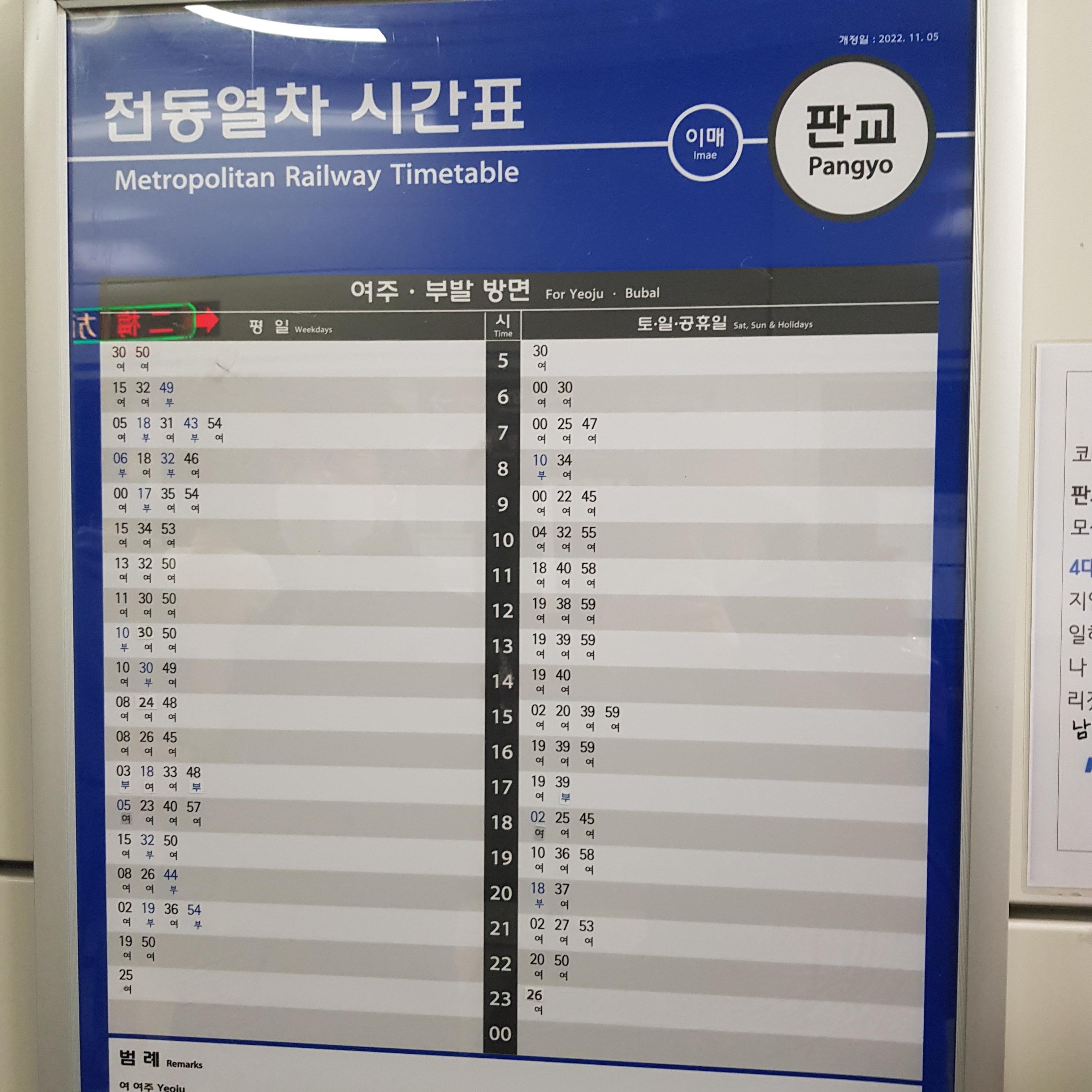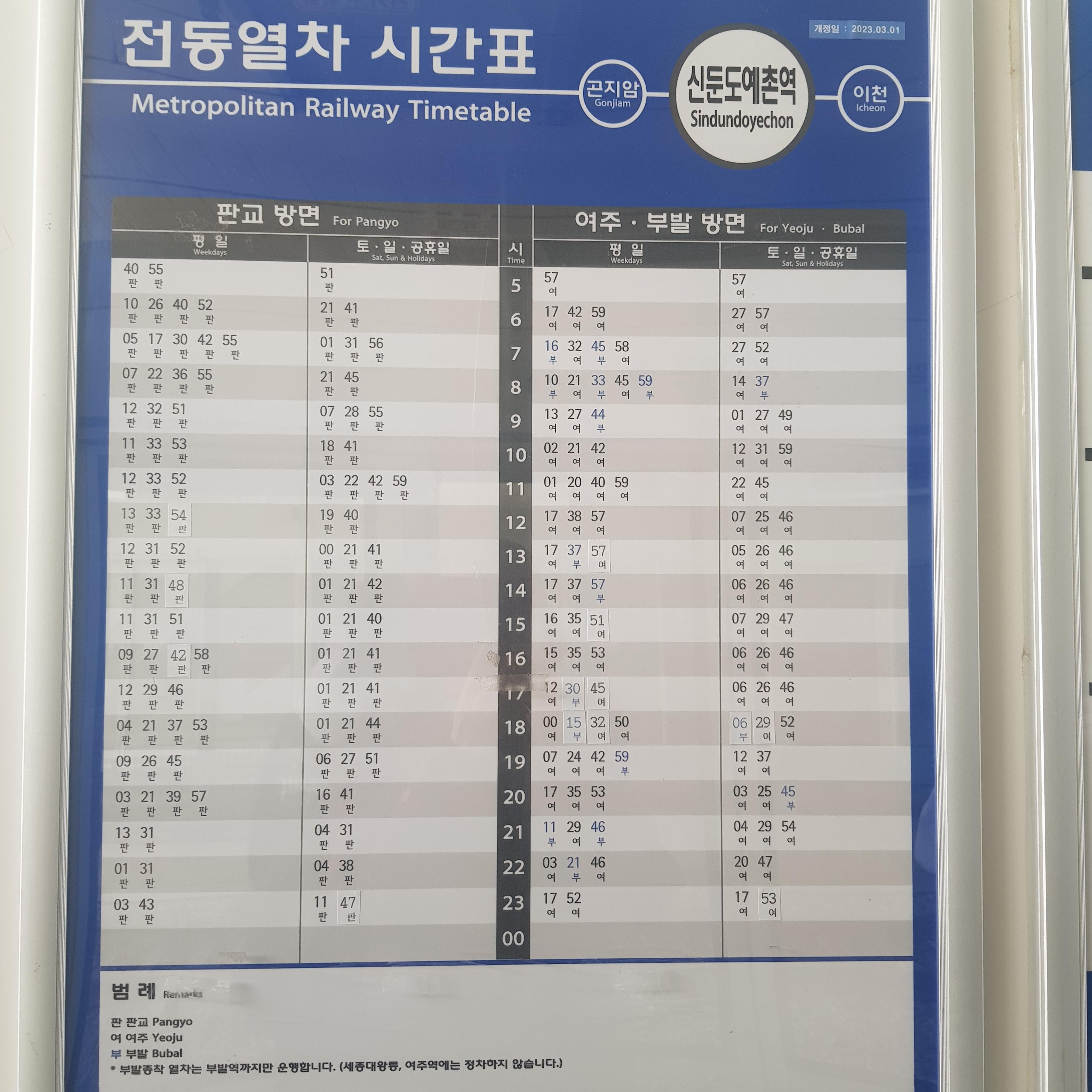 신둔도예촌역, 판교역 전동열차 시간표 입니다.